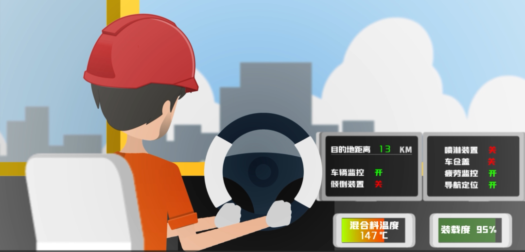 采用節(jié)能環(huán)保的智能環(huán)保運(yùn)輸車,車廂采用隔離劑自動(dòng)噴淋裝置,通過減少人工噴淋環(huán)節(jié),實(shí)現(xiàn)減少人工、提高施工效率的目的。智能環(huán)保運(yùn)輸車通過艙蓋關(guān)閉與保溫板的裹覆達(dá)到車廂內(nèi)的保溫效果,運(yùn)輸過程中通過安裝在車廂內(nèi)的溫度檢測(cè)裝置,實(shí)時(shí)監(jiān)控瀝青混凝土溫度,確保攤鋪現(xiàn)場(chǎng)瀝青混合料溫度處于可控范圍內(nèi),監(jiān)控信息實(shí)時(shí)傳輸至車輛顯示屏及主控屏幕,車廂內(nèi)物料溫度臨近預(yù)設(shè)值,系統(tǒng)會(huì)自動(dòng)預(yù)警(140度),并提醒司機(jī)盡快趕到施工現(xiàn)場(chǎng)裝卸物料或采取相應(yīng)措施。如溫度低于預(yù)設(shè)值(130度),系統(tǒng)會(huì)提醒司機(jī)及管理人員,該物料溫度過低無法使用。成品瀝青混合料通過卸料口與自動(dòng)移車平臺(tái)進(jìn)行聯(lián)動(dòng)作業(yè),保證裝料平整度,避免物料離析,封閉式自動(dòng)裝車裝置不僅保護(hù)了駕駛員的健康,同時(shí)將產(chǎn)生的油煙收集后進(jìn)行處理達(dá)標(biāo)后再排放。