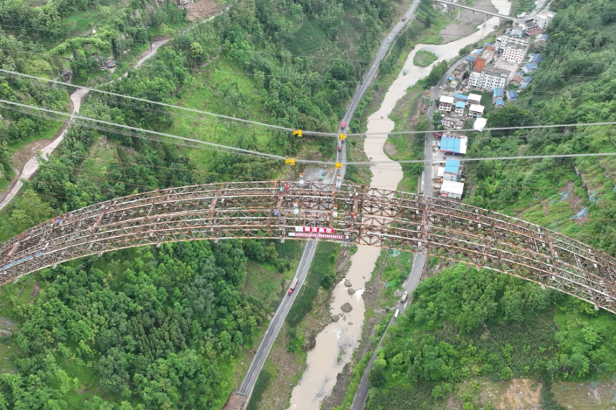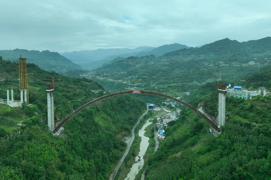 蘇壩特大橋具有“三大”特點(diǎn):一是施工難度大,主橋施工采用無支架纜索吊裝工藝,且施工區(qū)域位于陡崖地段,主橋跨越國道及縣道,施工組織難度大、風(fēng)險高;二是施工作業(yè)面高,作業(yè)面距河面近300米,相當(dāng)于100層樓的高度,施工期間還面臨山區(qū)極端氣候影響;三是合龍精度高,通過精細(xì)化有限元模型仿真計算及全過程高精度測量控制,合龍段軸線誤差控制在5毫米以內(nèi),高程控制在7毫米以內(nèi),實(shí)現(xiàn)了勁性骨架高精度合龍。