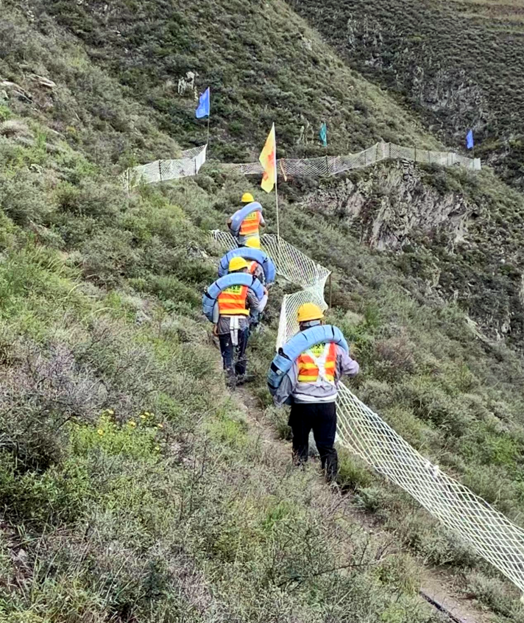 該滑坡點距地面垂直距離300余米,施工面窄,材料無法通過機械設備運輸至施工現(xiàn)場,給搶險工作帶來了較大影響。為及時解決滑坡帶來的安全隱患,突擊隊第一時間制定了科學合理的搶險方案,青年黨員們更是組成了一支“先行隊”,不懼艱險,徒步向山頂運送安全繩、錨桿、鋼筋等材料,同時在滑坡面開展人工清危并鋪設防護網(wǎng)、噴射砼進行防護。