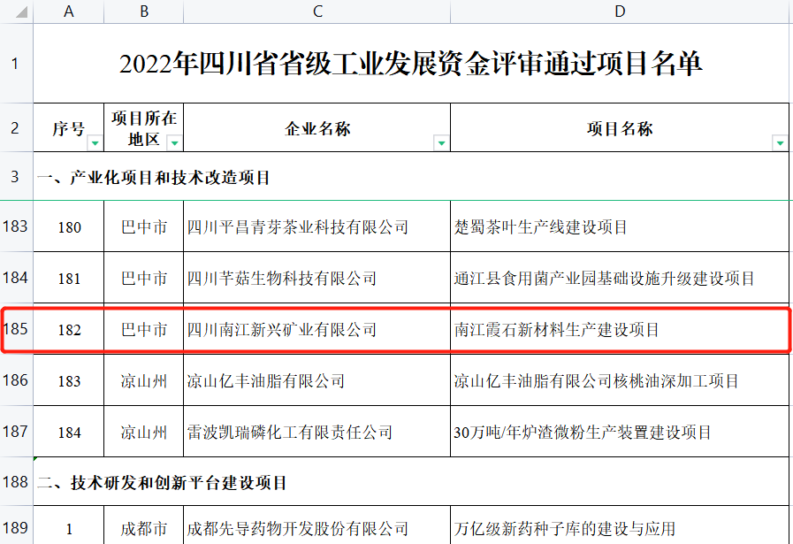 近日,四川省經(jīng)濟(jì)和信息化廳公布了2022年四川省省級(jí)工業(yè)發(fā)展專項(xiàng)資金現(xiàn)場(chǎng)核實(shí)通過項(xiàng)目的名單,四川路橋新材料集團(tuán)鑫展望公司“南江霞石新材料建設(shè)項(xiàng)目”成功入選,獲得省級(jí)工業(yè)發(fā)展專項(xiàng)資金218萬元。